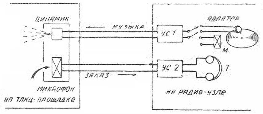 Работниками радиоузла Центрального парка культуры и отдыха им Горького собрана установка, которая дает возможность посетителям парка непосредственно с танцовальной площадки заказать желаемую танцовальную музыку. Схема установки очень проста. На танцовальной площадке устанавливается микрофон, соединенный с радиоузлом. Через этот микрофон посетитель парка передает заказ на радиоузел.