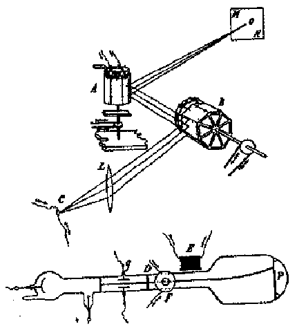 Розинг занялся исследованием фотоэлектрических свойств других веществ. Следствием этого явилось решение применить в передающем устройстве щелочной фотоэлемент с внешним фотоэффектом. Для проектирования световых лучей отдельных участков передаваемого изображения С на фотоэлементе МК Розинг сконструировал систему из двух многогранных зеркальных барабанов А и В, вращающихся с разными скоростями.