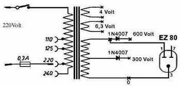 Он имеет накал 4 В, что практично для ламп этой серии, в которую входит много кенотронов. Можно применить EZ 12, она является высоковольтной: 2х300 = 600 В.
